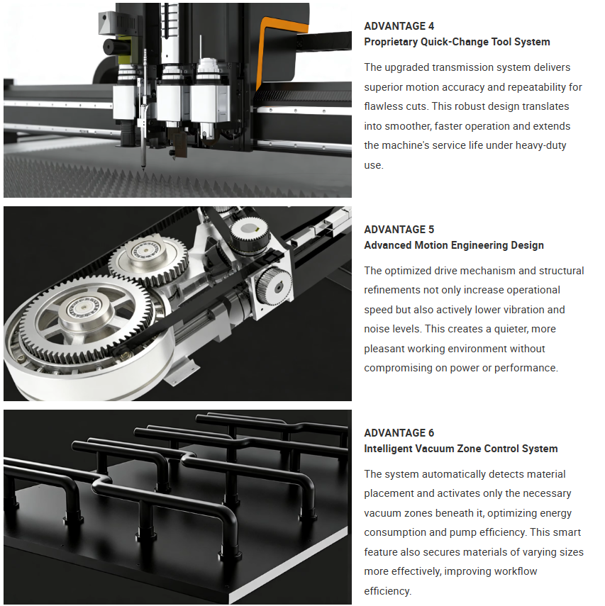 REMEYA Oscillating Knife Cutting Machine is precision engineered and optimized for efficiency. Featuring a heavy-duty worktable of 1600x2500mm, this machine features best-in-class positioning accuracy of ±0.05mm, allowing for perfect cuts with all materials. Featuring a 5.5KW spindle motor and a Swiss-made MAXON high-speed vibrating cutter head, the machine allows for smooth and high-speed cutting at speeds of up to 78 meters/minute.