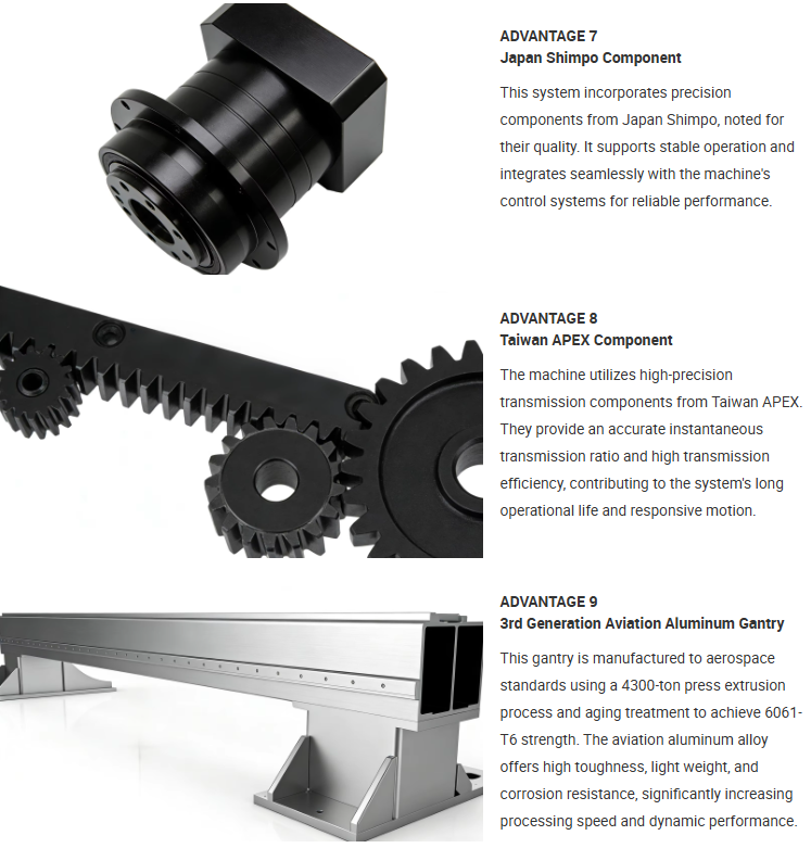 Durability in a laser engraving machine is non-negotiable for a professional setting. The machine’s structure, from the welded steel base to the 3rd Generation Aviation Aluminum Gantry, is designed for long-term resilience. The aerospace-grade aluminum alloy gantry is exceptionally strong yet lightweight, contributing to the machine’s high speed and acceleration (up to 0.8G) while resisting corrosion. Supporting this are Japan Shimpo components and other international brand electrical parts like Schneider and Omron, which are industry standards for reliability.